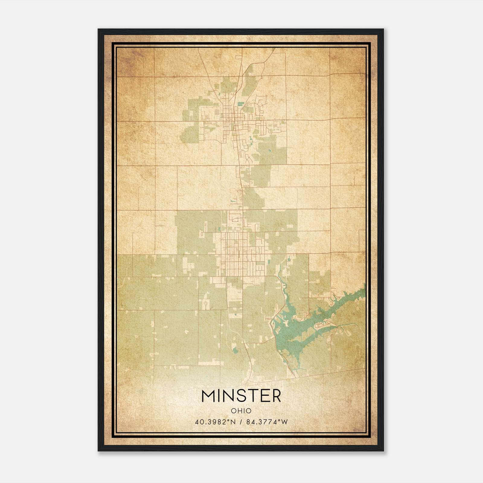 Vintage Minster Ohio Map Poster, Minster OH City Road Wall Art